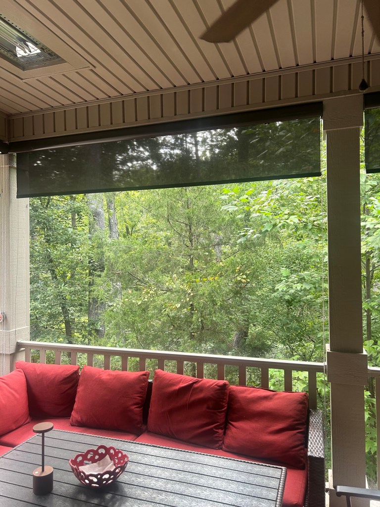 Sun and Shade: Deck or patio is partially covered for shade but also has space in the sun. In addition, we added sunshades from Gotcha Covered to block the sun in the summer but does not block our view of the woods.